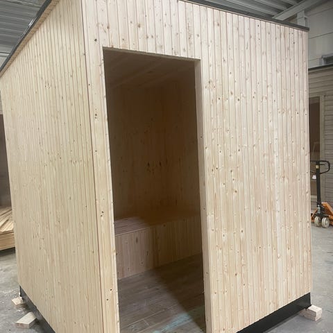 Liggande panel, härdade fönster och förrådsdörr i funkisstil. Lav i gran. Underlagspapp och ytpapp på tak. Säljs utan aggregat.
