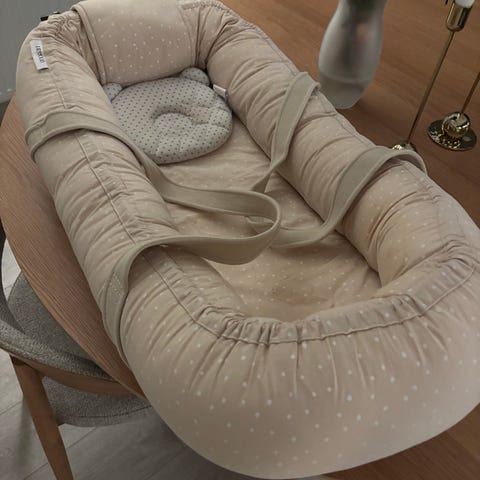 Babynest i rosa färg med vita prickar i jättefint skick. Designad för spädbarn. Tillverkad i mjukt material för komfort och trygghet.
