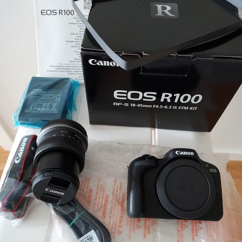 Canon EOS R 100 spegellös kamerahus inklusive RF S 18-45mm f/4,5-6,3 IS STM objektiv, minneskort, batteri, laddare, rem och kameraväska på köpet