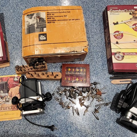 Överhandsfräs inkl 10 st frästillbehör. Mycket fint skick. Kommer från Biltema. Instruktionsbok.