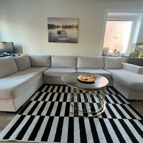 Beige hörnsoffa med schäslong och kuddar