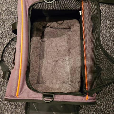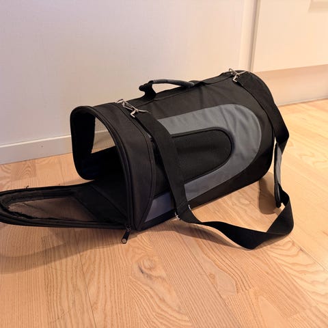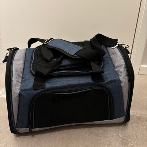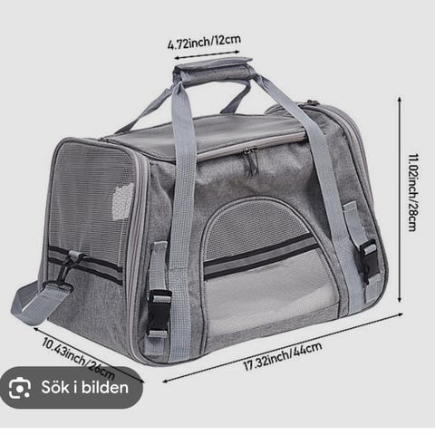 Transportväska för husdjur i grå färg, lämplig för att bära små djur. Väskan har öppning framtill och är tillverkad i material som ger ventilation och komfort för husdjuret under transport. En liten korg för mindre hund eller katt att mysa i medföljer.