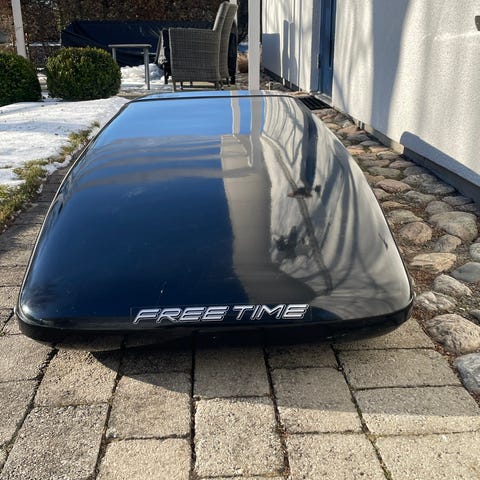 Äldre, lite använd takbox på BMW takräcke med fästen passande F11. Måtten är 92 x 212 cm. Behöver tvättas men är helt felfri under smutsen.