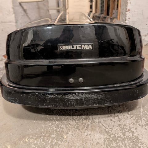 Äldre, men lite använd takbox på BMW takräcke med fästen passande F11. Behöver tvättas men är helt felfri under smutsen.