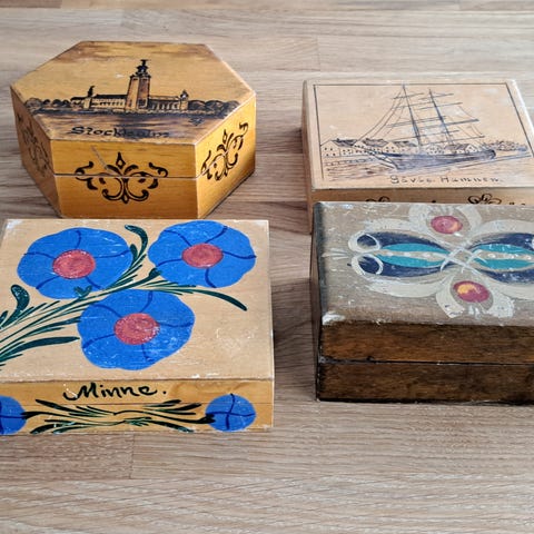 På ett lock till syskrin i trä målat dekorativt allmogemotiv, Målningen är gammal och välbevarad, från 1946.