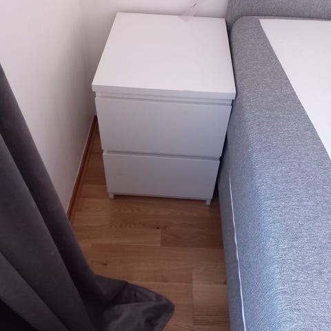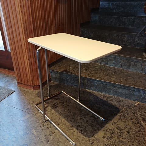 Två soffbord/sängbord i metall och ren design med två hyllplan. Lätta att flytta runt med handtaget och kan enkelt fällas ihop och förvaras i tex. garderob. 250:- för båda.