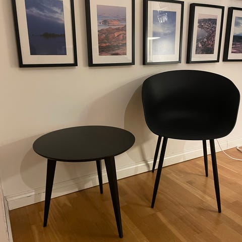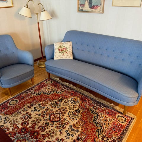 Rundrygg fåtölj med tillhörande pall av Carl malmsten skada på tyget under kudden annars inget som syns Nypris ca 50.000:- hem körning inom umeå ingår finns I Holmsund för visning ring