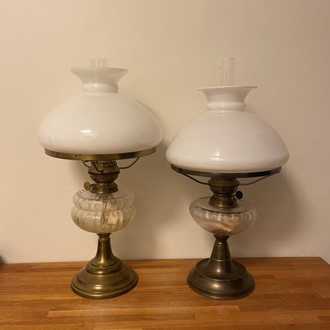En charmig fotogenlampa som har blivit omgjord till en elektrisk lampa. Den har en klassisk design med en vit lampskärm och en genomskinlig behållare. Perfekt som stämningsbelysning. Nypris:769kr.