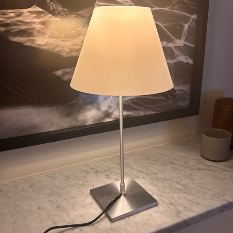 En Costanzina bordslampa från Luceplan med röd lampskärm i gott skick. Hämtas på Östermalm.