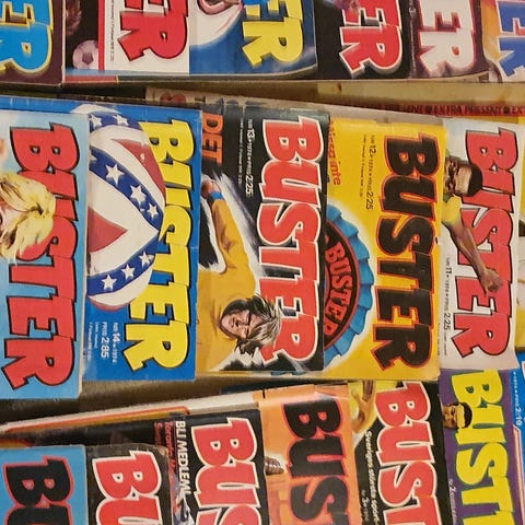 1) Buster, komplett årgång 1973-1977, 130 st, någon tidning namnad och har något urklipp (talong tävling), annars bra bruksskick