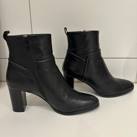 Svarta boots i storlek 38 med dekorativa nitar och tre spännen. Skorna har en låg klack och sulan är mönstrad för bättre grepp. Passar för vardagligt bruk.