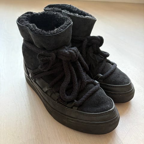 Inuikii Vinterskor i storlek 38 med svart färg. Skorna har detaljer med nitar och band med Inuikii-logotyp. Sulan är mönstrad för grepp och insidan är fodrad för värme och komfort. Litet glapp i fodret (se sista bilden) men märks inte vid användning lätt att laga.
