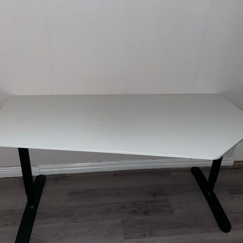 Ett IKEA skrivbord med svarta ben och ljus träskiva