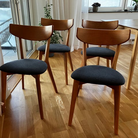 Snygga ekstolar i dansk design med svart lädersits, sköna att sitta på och de gör sig riktigt bra runt matbordet. Stolarna har ett fint helhetsintryck; se bilder. Men hos oss blev de tyvärr inte rätt nyans mot vårt ekbord, så därför säljer vi setet. (Har ersatt med samma typ av stol, men annan kulör) Stolarna är stapelbara.