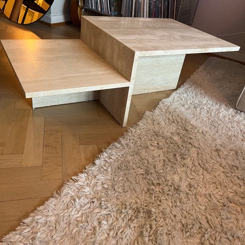 Säljer ett stilrent soffbord i ljus stenliknande finish med två nivåer. Den smarta formen gör bordet lättplacerat och praktiskt, perfekt som soffbord, sidobord eller avlastningsbord.