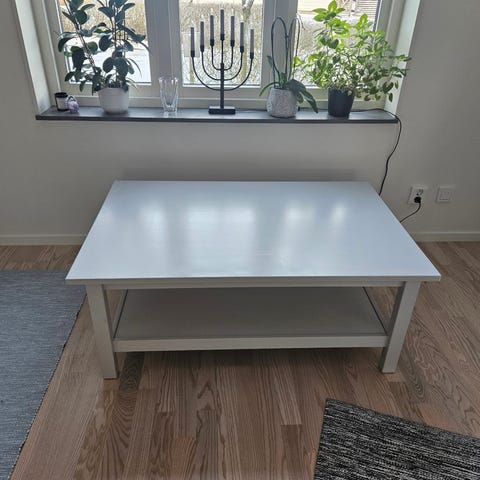 IKEA soffbord med rund form och vit yta. Bordet har öppna förvaringsfack runtom och ben i metall. Designen är modern och passar för vardagsrumsmiljöer.