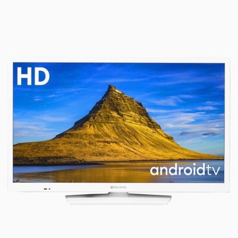 12V-adapter, 230V-aggregat, TV-fötter, AV-kablar, fjärr, Chromecast och monterat väggfäste ingår.
