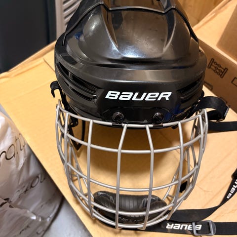 Bauer ishockeyhjälm junior (48-53,5 cm, 6-6,5), med metallgaller. Justerbara remmar för att passa olika storlekar.