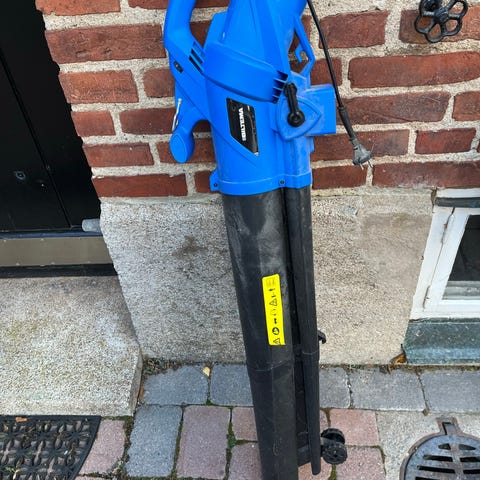 i blå och svart färg. Elektrisk enhet med handtag för enkel användning. Används för att blåsa bort löv och skräp.