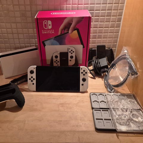 Nintendo Switch oled spelkonsol med två Joy-Con-kontroller i rött och blått. Konsolen levereras med laddstation, handkontrollshållare, bärväska, två spelkassetter och nödvändiga kablar för laddning och anslutning. Passar för spel på TV eller som bärbar enhet.