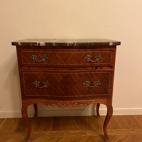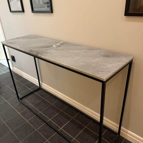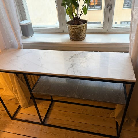Sideboard med vit/grå marmorskiva. Stativ i roseguld.
