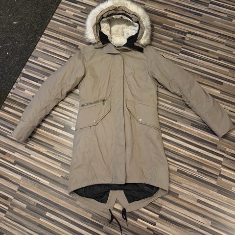 Canada Goose dunjacka i storlek M för kvinnor. Jackan är grön och tillverkad av dun, vilket ger isolering och värme. Passar för utomhusbruk och kyligare väder.