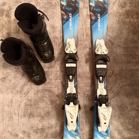 Två par skidor med tillhörande pjäxor storlek 28,5 och23,5 säljes. Dessa är använda en säsong. Även ett par stavar ringer.