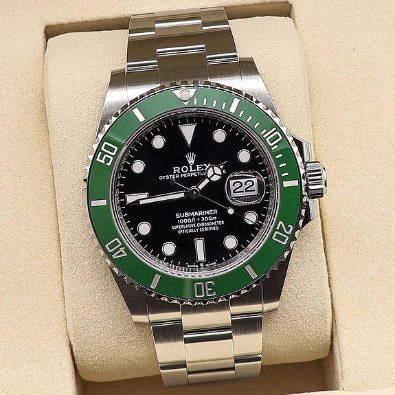 Klockan levereras full set och komplett med samtliga boxar, certifikat, manualer samt grön Rolex-tag. Även bezelskydd ingår.