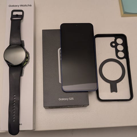 Säljer en Samsung Galaxy S25 FE i färgen svart med 128 GB lagring, tillsammans med en Samsung Galaxy Watch 7 (44 mm).