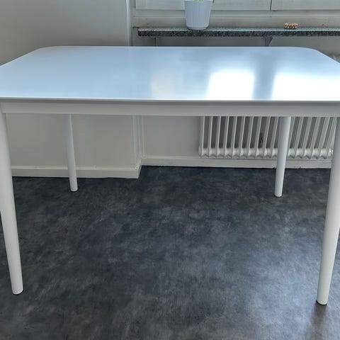 Säljer ett fint vitt matbord och 4 vita stolar.