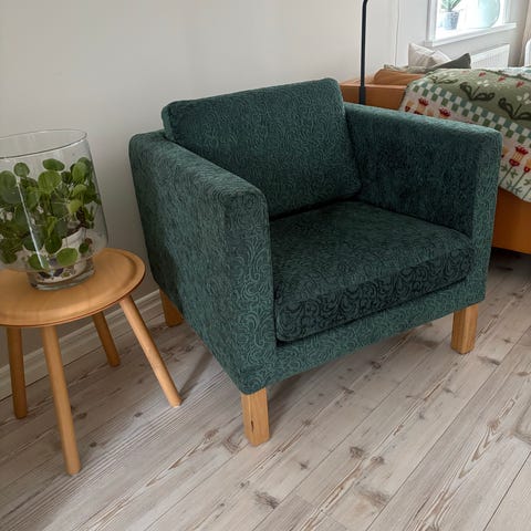 Fåtölj på hjul i framkant. Slitstarka.