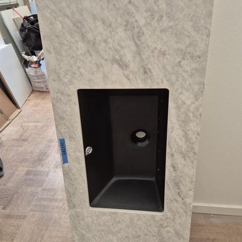 Björbo Badrum Mejda "Black Sand" bänkskiva med underlimmat Duravit Foster tvättställ. Skivan har en hål för blandare och tvättstället ett hål för avlopp i mitten (bottenventil och blandare ingår ej).