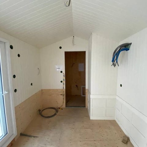 Invändigt består väggarna av OSB skivor och gips. Innertaket består av vit takpanel.