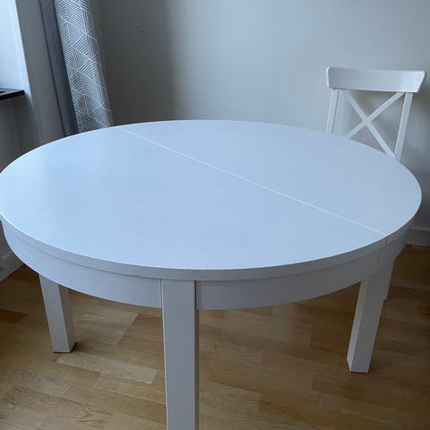 Runt matbord som går att dra ut så det blir ovalt. Ny pris 3999 kr .Skavanker finns 2 stycken, samt en limfläck se bild.