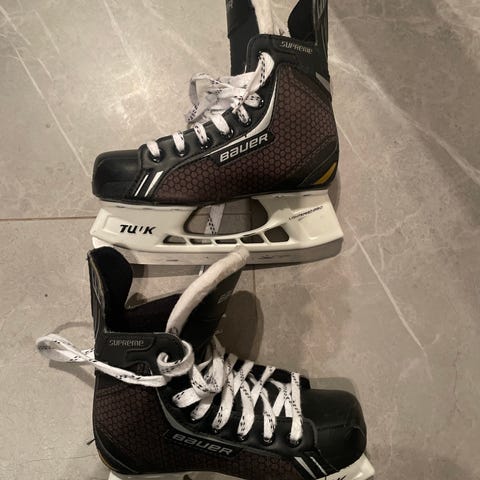 Ishockeyskridskor i barnstorlek 35 (22,8 cm) med svart och blå design. Skorna är anpassade för ishockey och har snörning för justerbar passform.