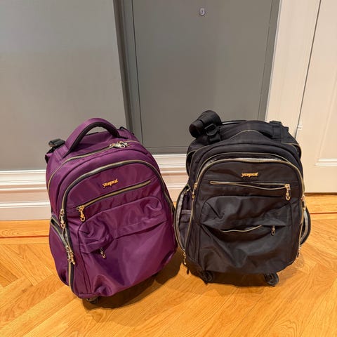 Väskan har axelrem, flera fack och utrymmen för förvaring.