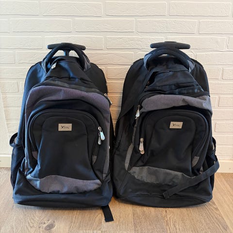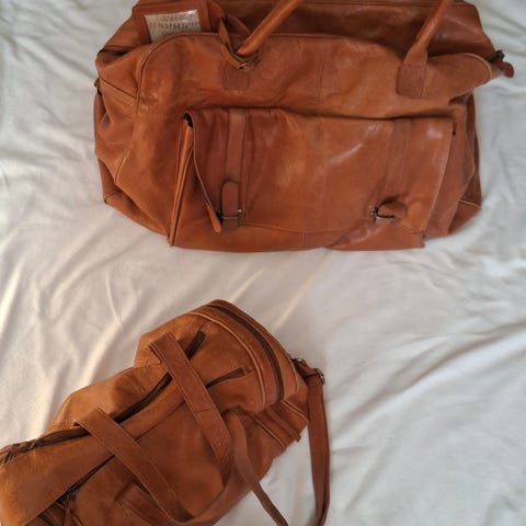 Set med flera resväskor och väskor i brunt läder. Väskorna finns i olika storlekar, från större weekend- eller sportväskor till mindre axel- eller necessärliknande väskor. Samtliga är tillverkade i läder med dragkedjor och bärhandtag, vissa med axelrem. Passar för resor, träning eller vardagsbruk där olika storlekar behövs för kläder, skor och mindre personliga tillhörigheter.