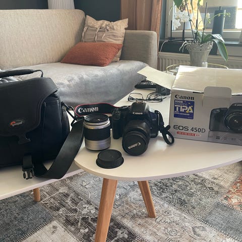 Canon EOS 1000F systemkamera i svart färg. Kameran har ett objektiv med manuell fokusering och är utrustad med en LCD-display.