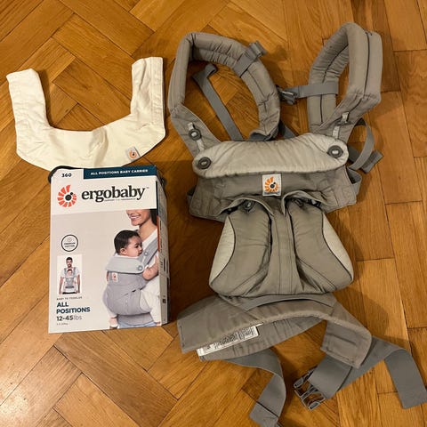 Ergobaby Carrier bärsele i färgerna grön och svart. Designad för att bära barn bekvämt och säkert. Material och storlek anpassade för användning av föräldrar och vårdgivare. Produkten inkluderar även instruktionsbok för korrekt användning.