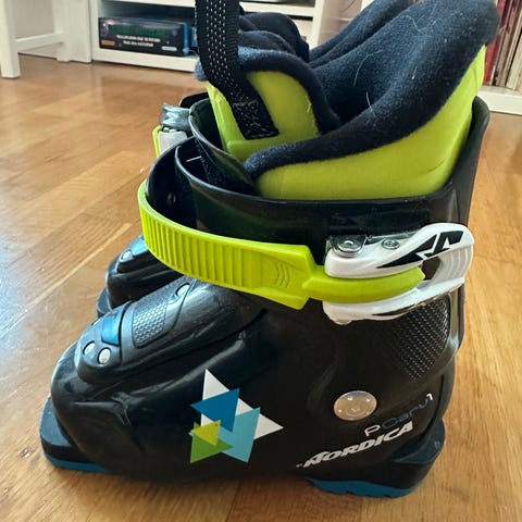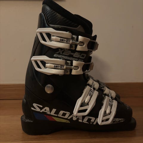 Använda, dvs finns repor på utsidan. Alla spännen är hela och pjäxorna är fullt funktionsdugliga.