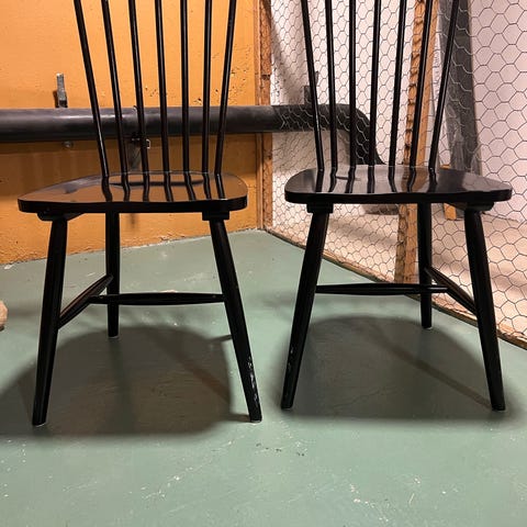 Mörkgröna köksstolar, pinnstol i Lilla Åland-stil. Bruksslitage, men går att åtgärda.