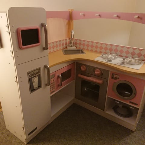 Leksakskök med spishäll, vask, ugn och skåp. Samt mängder med tillbehör.
