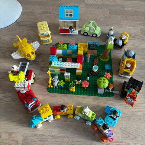 LEGO DUPLO byggklossar och figurer i olika färger och former. Innehåller djurfigurer, människor , plattor att bygga på, tåg, ubåt och flera olika klossar för kreativ lek. Djur och rökfritt hem.