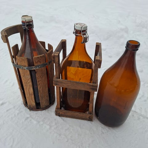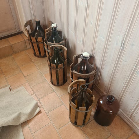 Svagdricksflaskor med fina träkorgar.