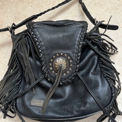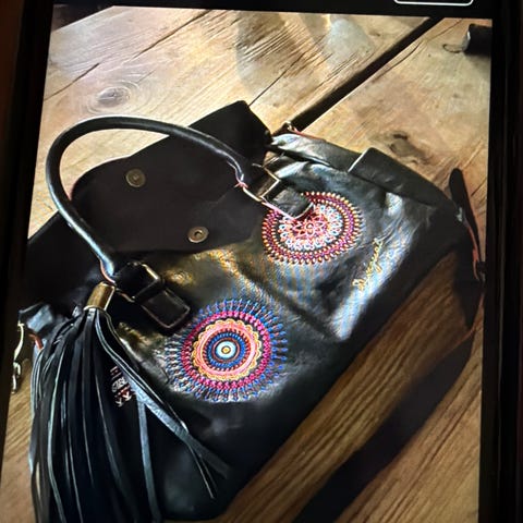 Desigual läderväska för kvinna med dekorativa nitar och mönster i flera färger. Axelrem för bärning över axeln. Väskan har en rundad form och detaljer i läder.