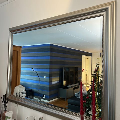 Stor spegel i silvrig vintagelook. 130×94cm, vägghängd.