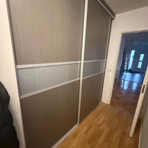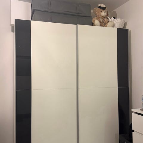 Säljer denna garderob med skjutdörrar från IKEA som inte är använd mer än två månader. Har en liten reva på ena sidan, men inget som stör funktionen. Sväljer mycket kläder och klarar tung vikt på stängerna.