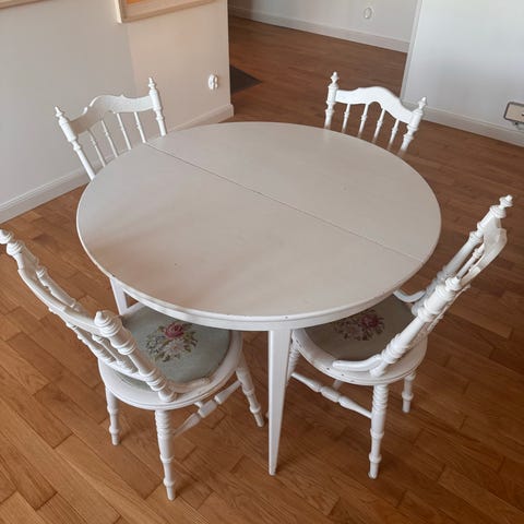 Runt bord med iläggsskivor + 4 stolar, 60-tal