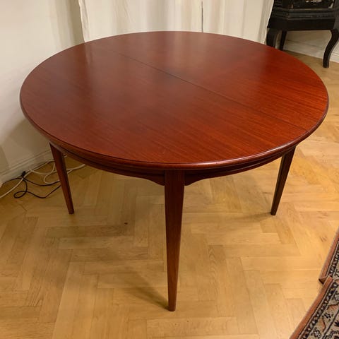 Runt matbord i kanske teak eller valnöt med 2 iläggsskivor om 40 cm vardera, rymmer utan vidare 8 personer fullt utdraget. 50- eller 60-tal, utmärkt skick!
