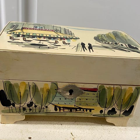 Klassiskt smyckeskrin med speldosa. Skruva upp speldosan på skrinets baksida så spelas en melodi samtidigt som en ballerina snurrar runt när du öppnar locket på skrinet. Spegel i locket.